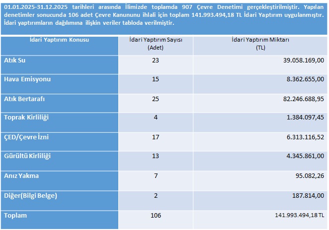 01.01.2025-31.12.2025 tarihleri arasında İl Müdürlüğümüzce yapılan denetimler ve uygulanan idari para cezaları