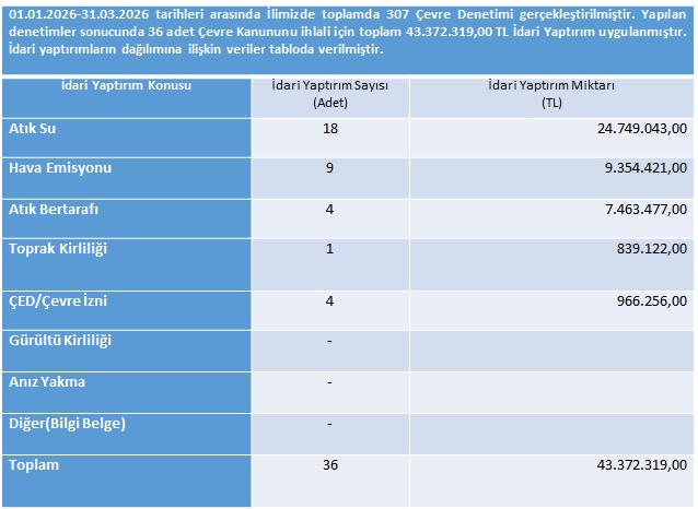 01.01.2026-31.03.2026 tarihleri arasında İl Müdürlüğümüzce yapılan denetimler ve uygulanan idari para cezaları